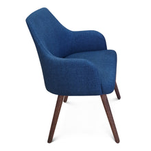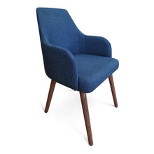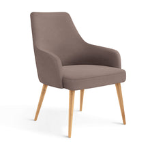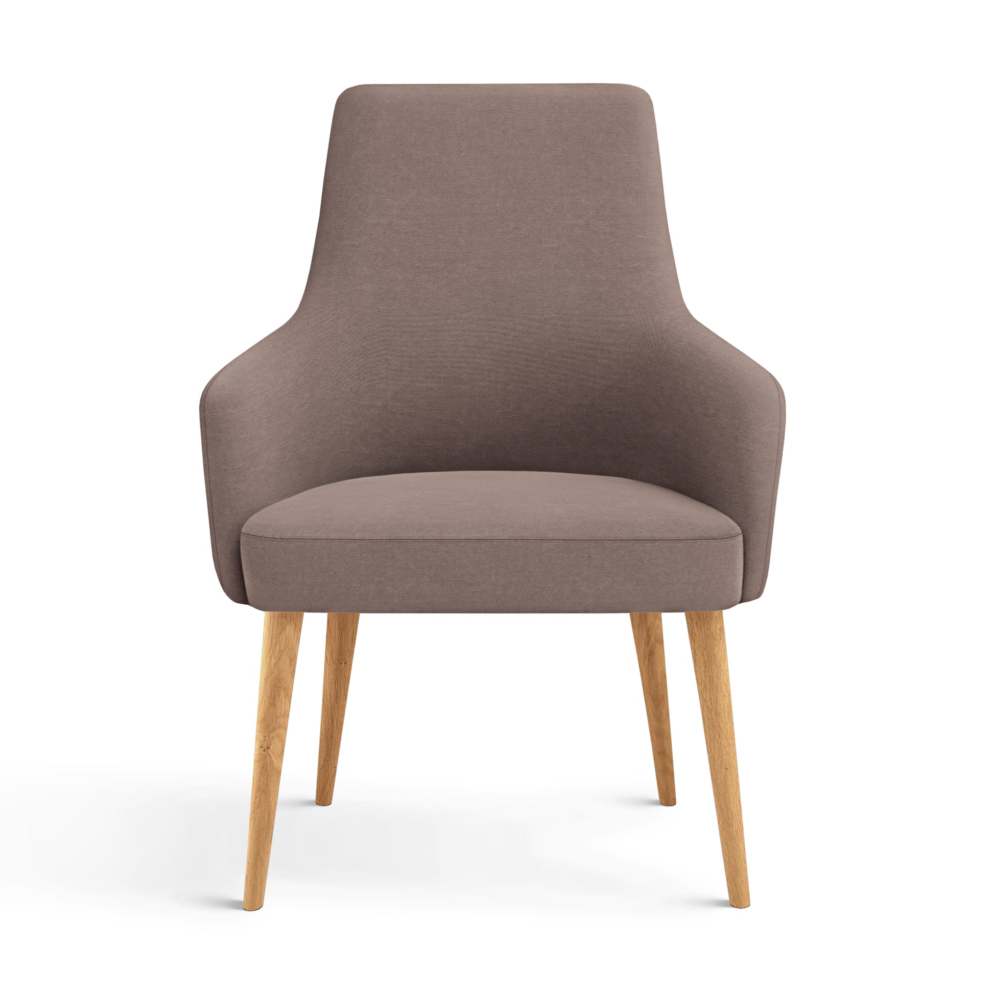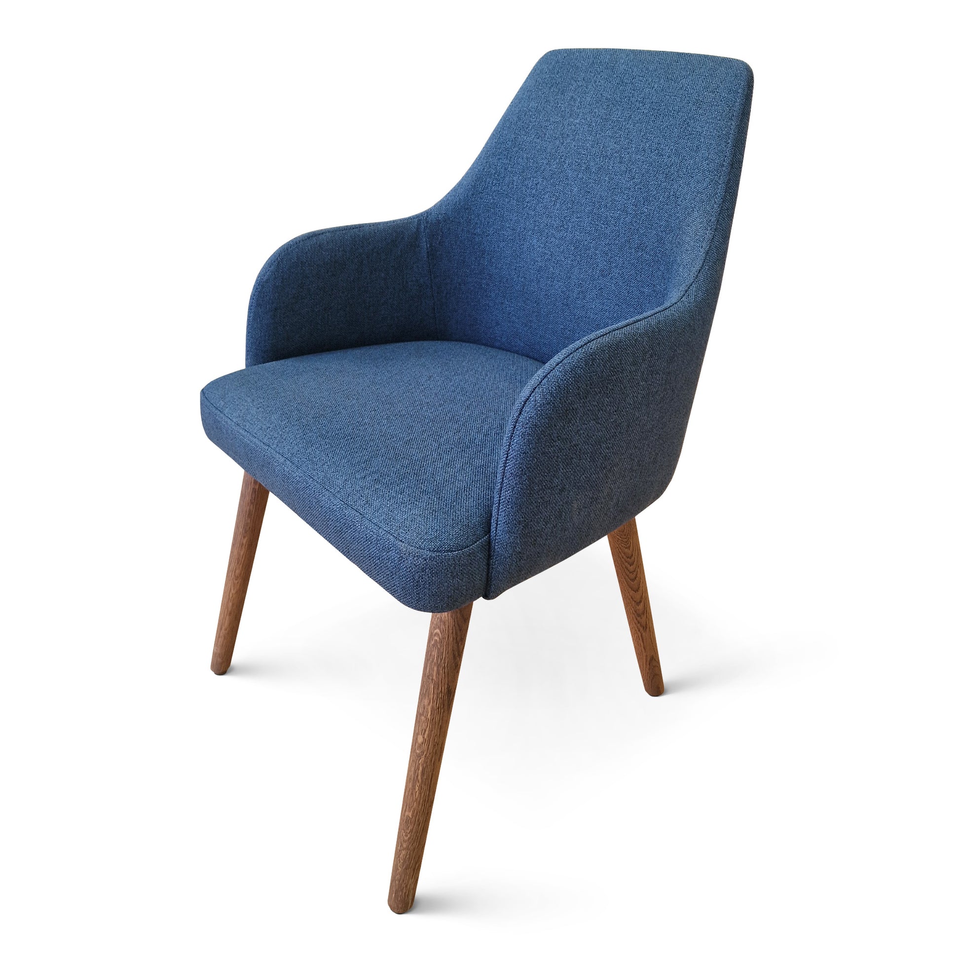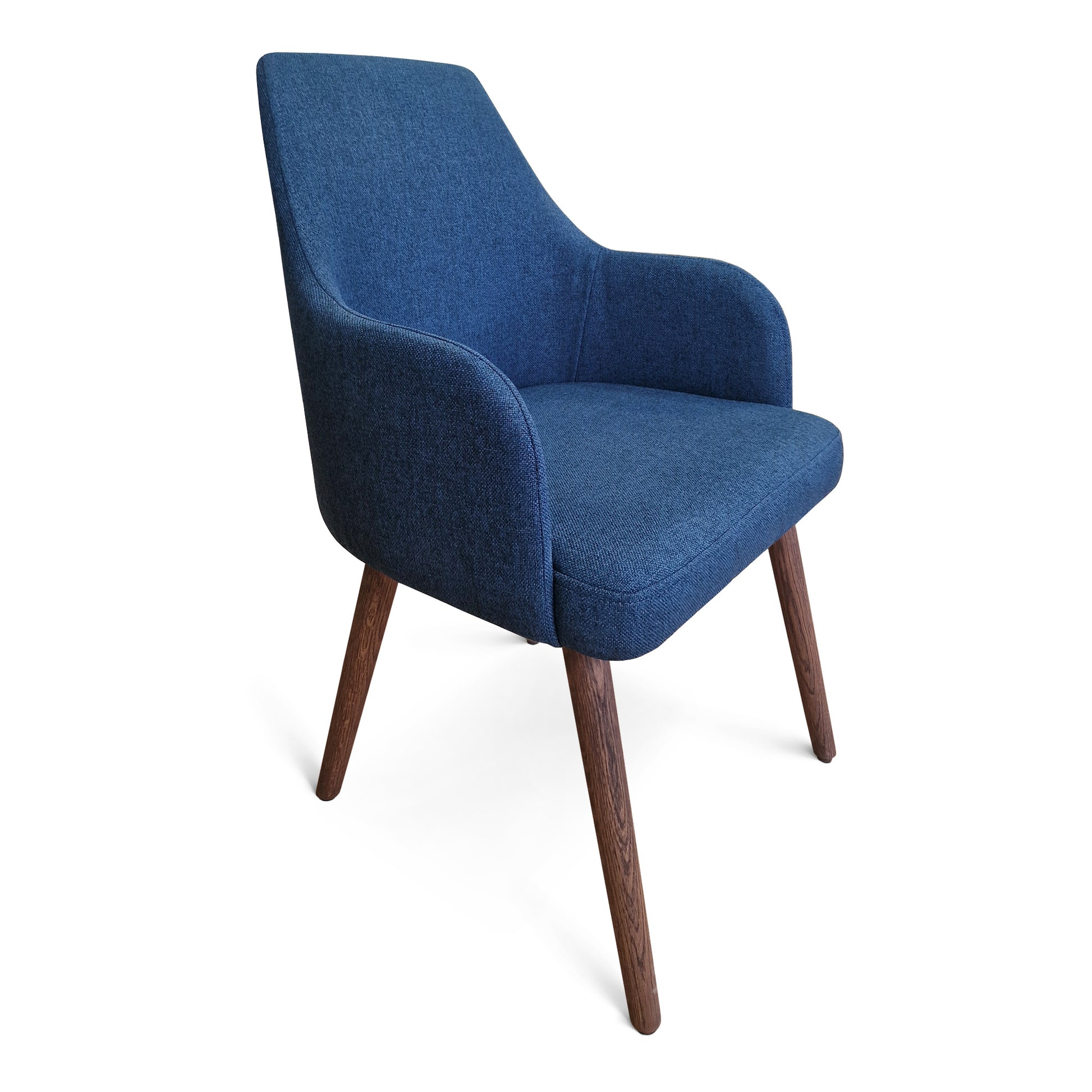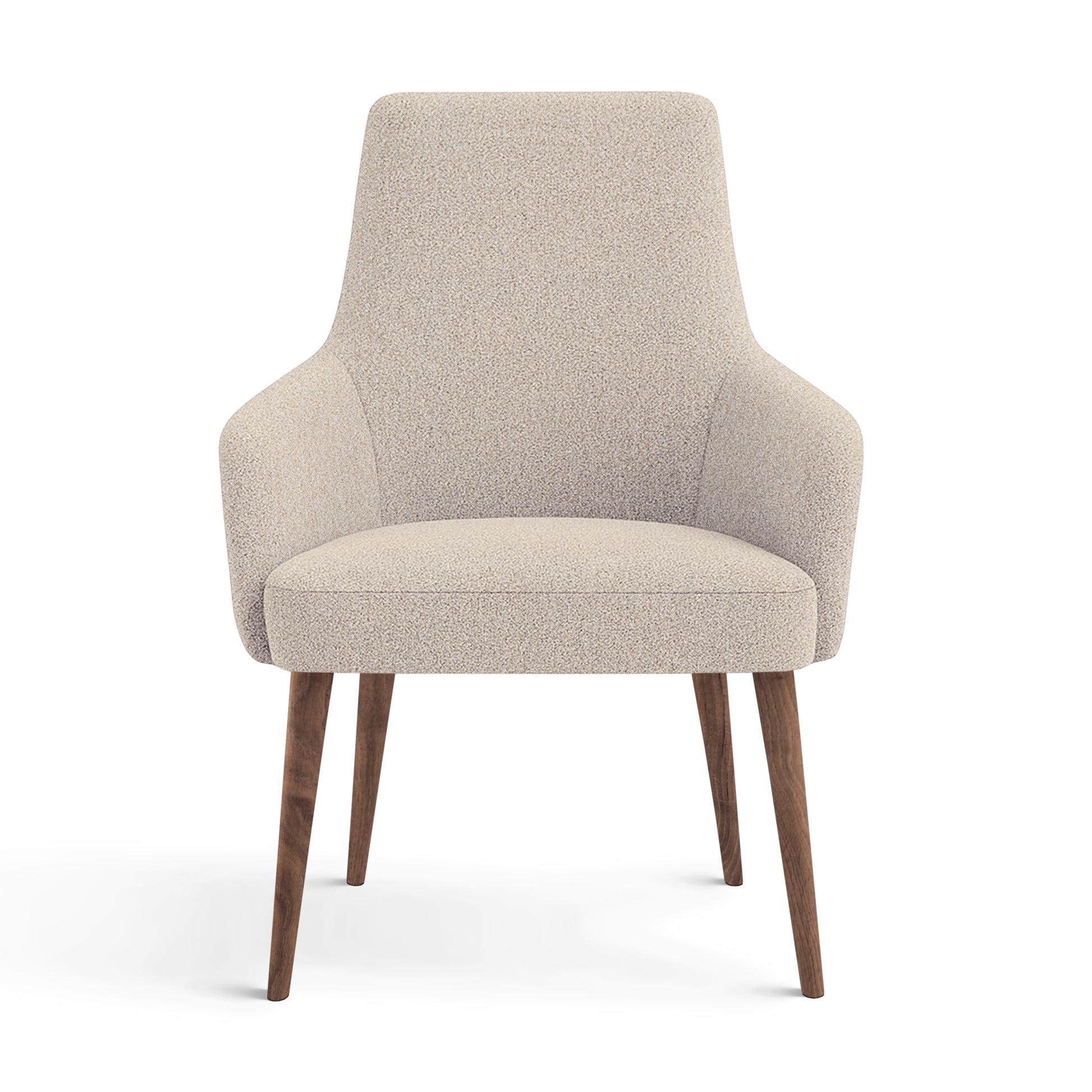 The Celeste Armchair combines sculptural lines with soft curves, offering a refined yet welcoming seat for dining, working, or relaxing. Its high back and gently flared arms provide comfort and support, while the sleek, tapered wooden legs add a timeless finish.