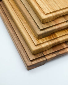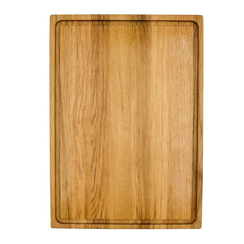 Our wooden chopping board is crafted from a sturdy oak or walnut with a divot edge to collect juices and crumbs as you cut, or flip the board over to serve cheese, charcuterie or appetizers. Modern yet timeless, our edge-grain cutting board can be used as carving blocks offering versatility, classic good looks and a natural durability that stands up easily to everyday use.