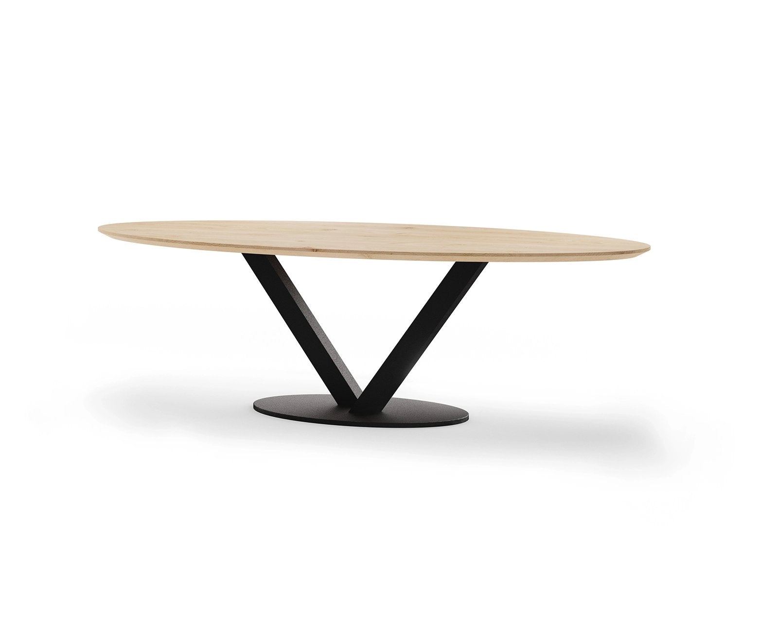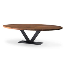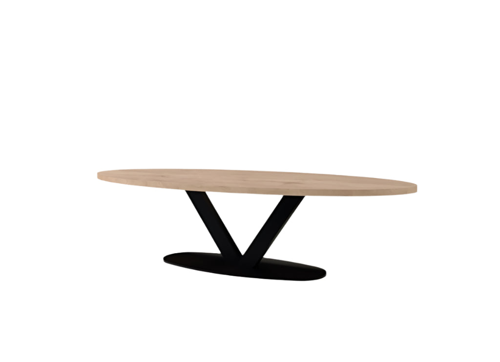 The Metal Frame Table N1 combines elegance and durability with its walnut top and steel V-shaped base. Made to order, it’s available in European solid walnut or Oak as well as Oak or American walnut veneer, customizable to the nearest cm in sizes from 100 to 350 cm.